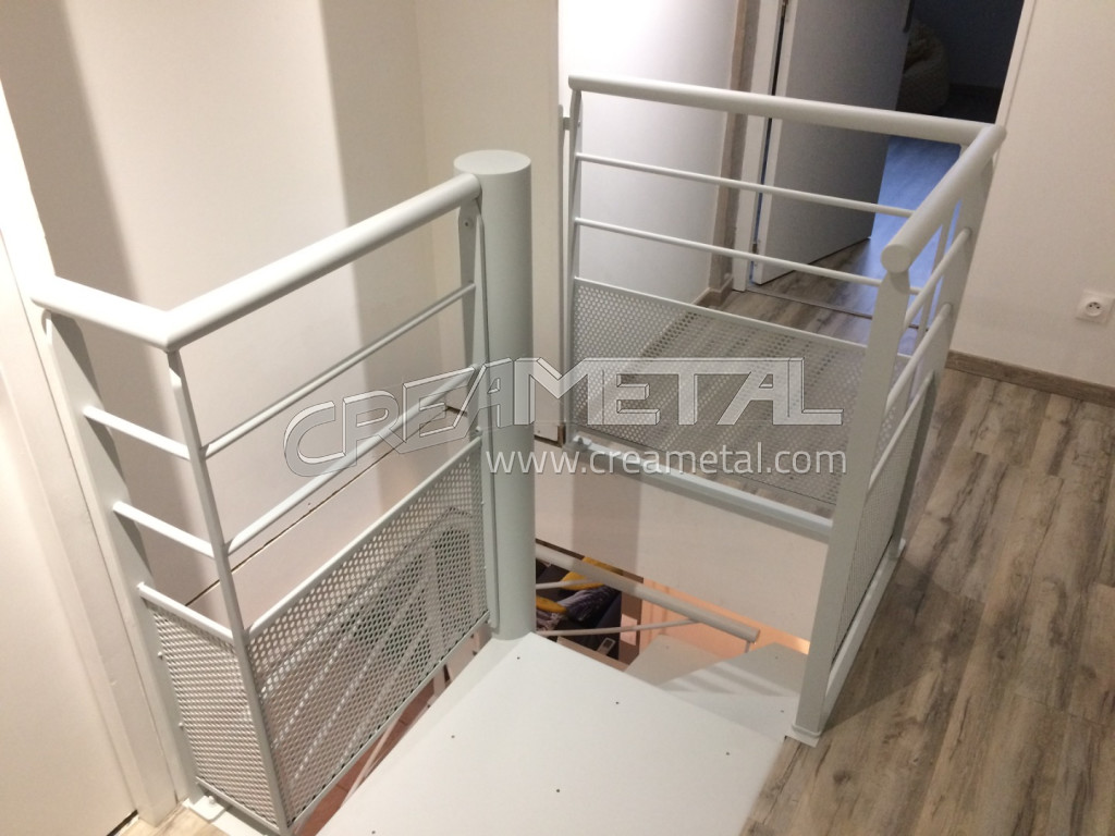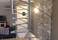 Escalier hélicoidal avec fût central cylindrique, comprenant des marches balancées en acier et des garde corps cintrés sur mesure.