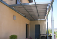 Pergola terrasse avec ossature principale en tube aluminium et revêtement avec toile tendu solaire "soltis 86 ".