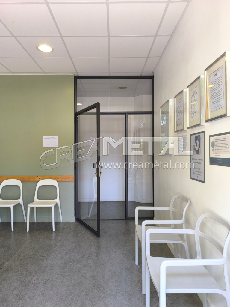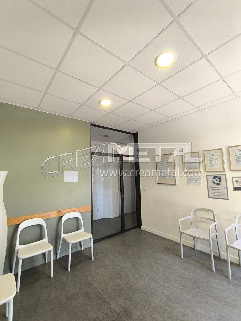 Conception sur-mesure d'une verrière pour séparation entre salle d'attente et espace de soins dans un cabinet infirmier.