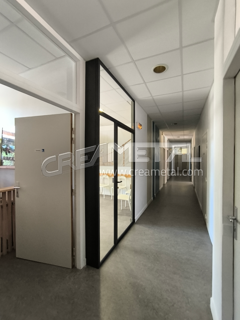 Prise de côtes, étude et fabrication de cette verrière intérieure sur-mesure en Acier avec intégration d'une porte battante.