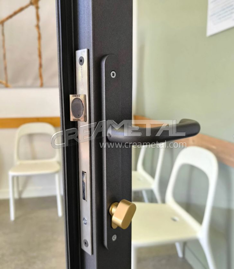 Cette verrière est constitué d'un châssis périphérique avec un imposte en parti haute et une porte battante ont la condamnation est unilatérale.