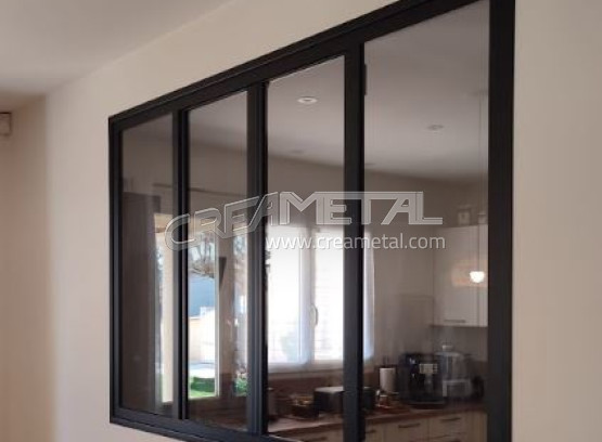 Cette verrière intérieure sur-mesure en acier intégre deux vitrages fixes et deux vitrages ouvrants centraux, se rabbatant à 180° sur les éléments fixes.